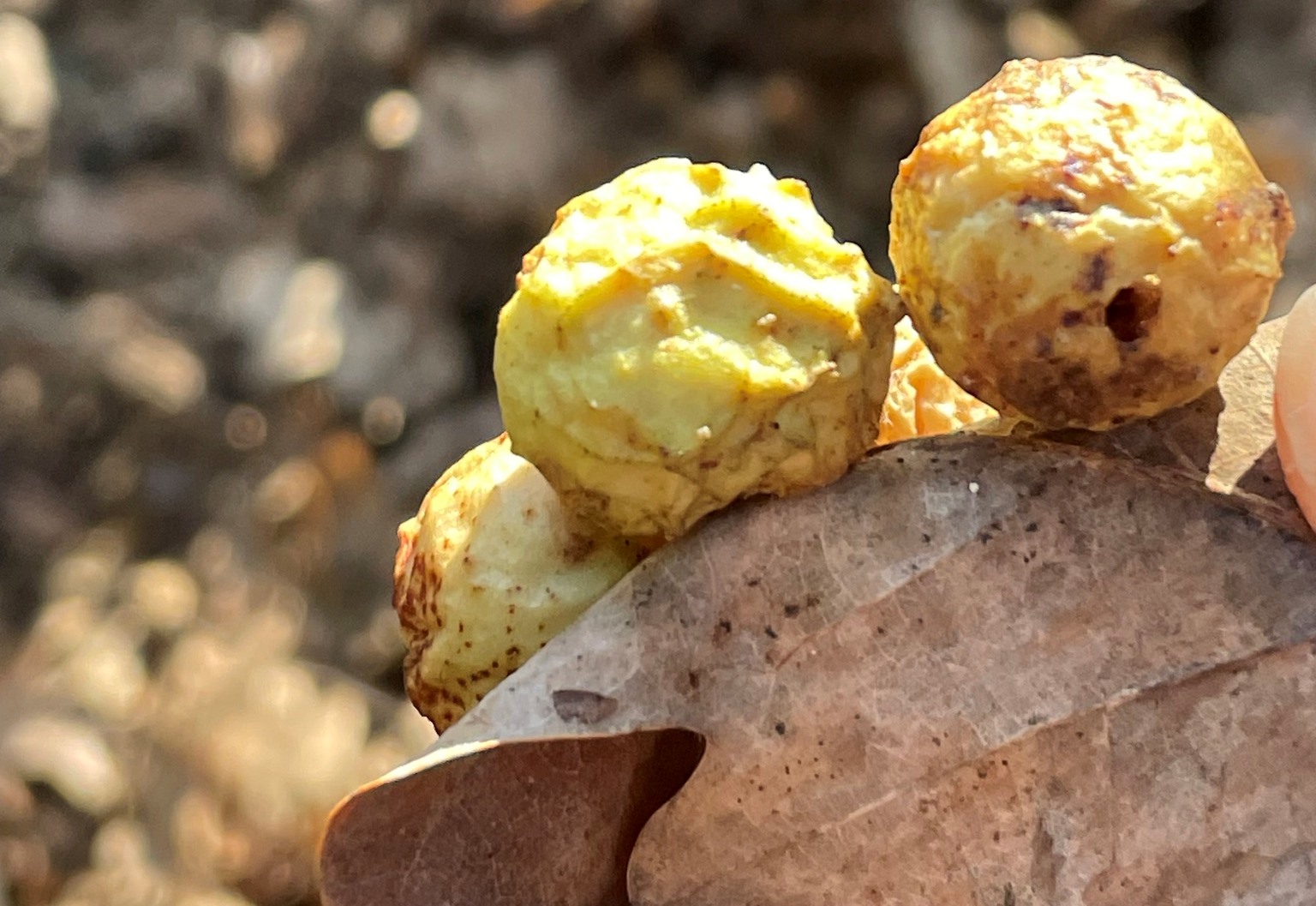 Дивні яблука можна побачити навесні на минулорічному листі дубу. Це гали – паразитичні новоутворення на листях та інших органах рослин, які виникають внаслідок подразнення клітин рослини різноманітними комахами, які відкладають в тканину рослини свої яйця. Коли з яйця викупляється личинка, вона починає виділяти ауксини – стимулятори роста плодів рослин, внаслідок чого навколо неї утворюється нарост, в якому личинка почуває себе дуже добре і в безпеці розвивається.